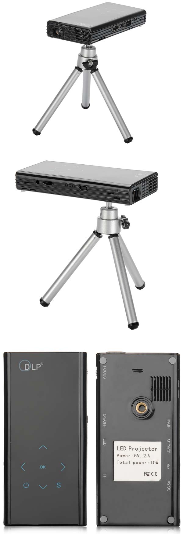 Размеры изделия составляют 130x62x20мм, вес равен 146 граммам. HD Man питается от батареи на 2500 мАч, с её помощью он может заряжать смартфоны, планшеты и другие умные устройства. В комплекте с новинкой идут следующие аксессуары: тринога, кабель питания, кабель USB, кабель AV, пульт Д/У, сумка для транспортировки.