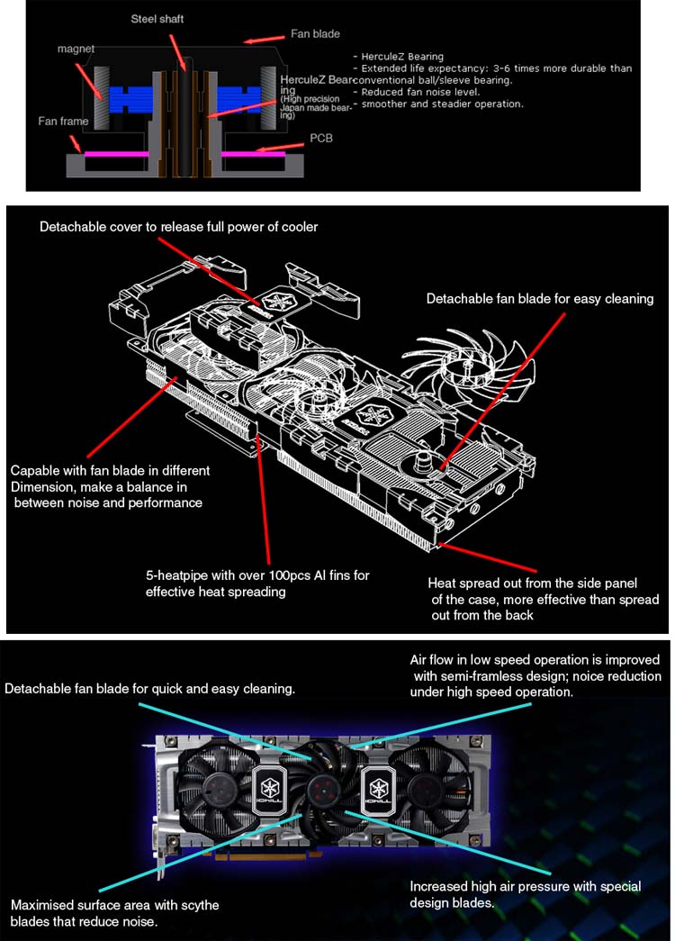 Далее, традиционно для Inno3D, на чёрном фоне, нам расписали кое-какие подробности, касаемо системы охлаждения новинки. Я в такие дебри лезть не стану и Вам, камрады, не советую - ибо любят PR отдели различных компаний рассказывать небылицы, расписывая плюсы своих кулеров, а в итоге получаются шумные и малоэффективные кулеры (как тот, что у HD 7870 HAWK от MSI). Хотя я, конечно же, всегда надеюсь на лучшее и буду очень рад, если у Inno3D кулер получится добротным.
