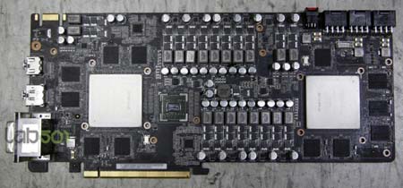 Как Вы уже знаете, эта монстрячная видеокарта построена на базе двух графических ядер GF110. Система охлаждения устройства трёхслотовая, используются высококачественные компоненты (Proadlizer и Super Alloy с компанией, обычное дело), печатная плата с 20-и фазовым питанием, иными словами покупатель эксклюзива (ведь, как и ARES, данный графический адаптер будет продаваться ограниченным тиражом) не будет разочарован.