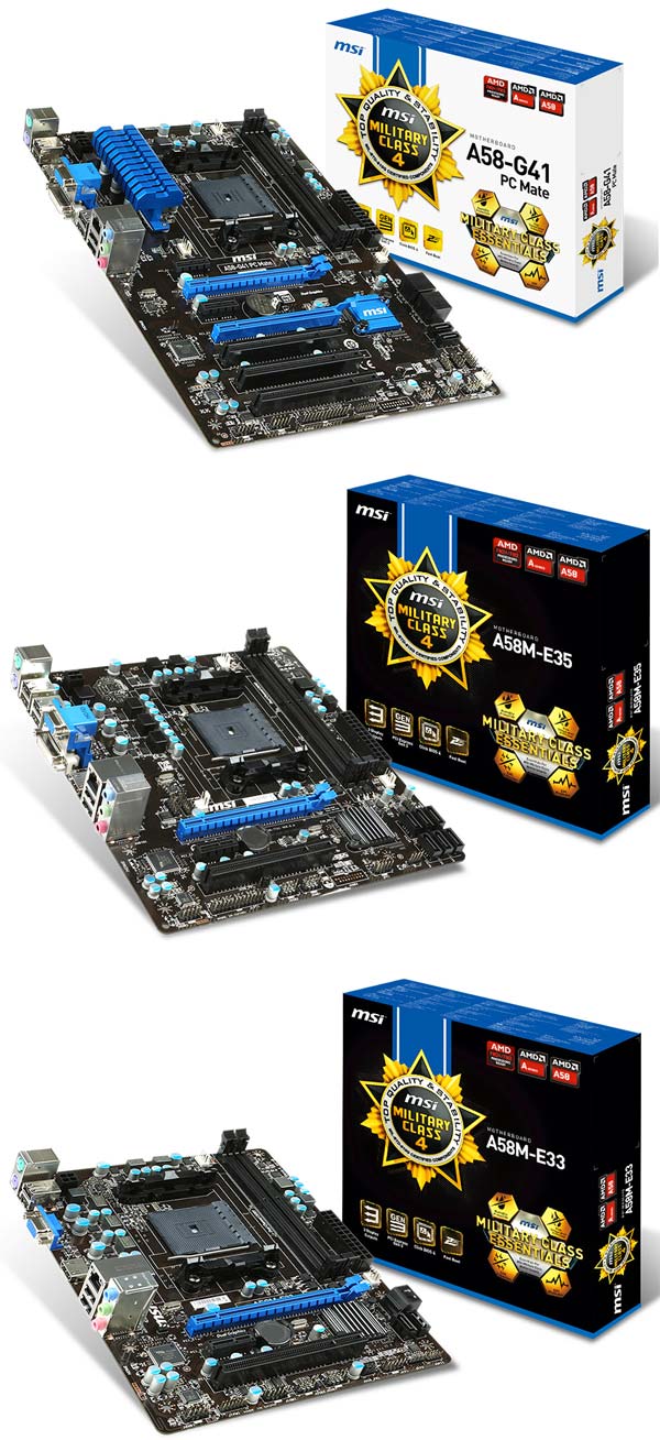 Фотографии материнских плат A58-G41 PC Mate, A58M-E35 и A58M-E33 от компании MSI