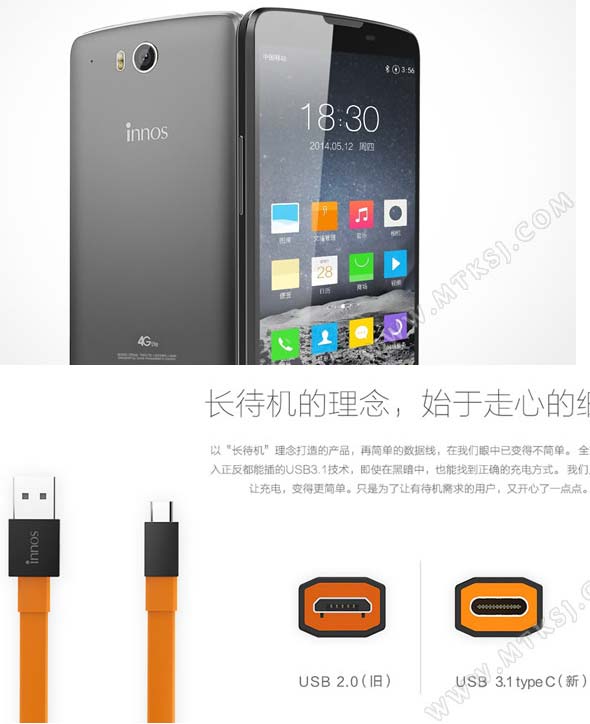 Изделие будет работать в сетях TD-LTE / FDD-LTE / WCDMA / TD-SCDMA / GSM, получит поддержку WiFi и Bluetooth 4.0, управляться будет Android 5.0. У изделия Innos две особенности - двойная батарея (4000+2000 мАч) с возможностью быстрой зарядки и наличие порта USB 3.1 Type-C. Звуковое решение от Wolfson, время автономной работы равно 7 часам 15 минутам в активном режиме.