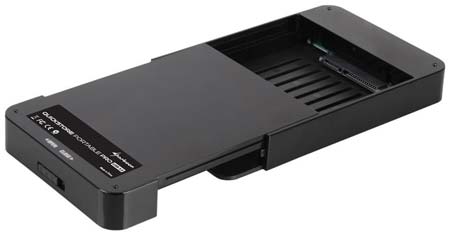 Габариты новинки: 134х82х18.5мм, вес - 80- граммов. Устройство имеет чёрный или серебристый цвет корпуса и подойдёт для SATA-жёстких дисков/SSD форм-фактора 2.5", толщина которых не превышает 12.5мм. В комплекте с QuickStore Portable Pro идёт софт для создания резервных копий данных (бэкапов). Существуют два варианта этого устройства - с USB 2.0 подключением, а также с USB 3.0. Думаю, что не нужно пояснять, какой из типов подключения более шустрый.