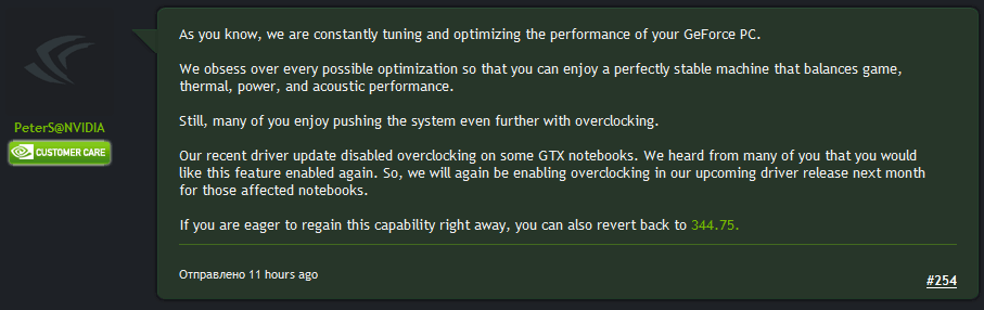 Теперь же, после массового негодования оверклокеров и простых геймеров на официальном форуме, компании пришлось объявить о том, что функционал разгона будет возвращён в драйверы, которые выйдут уже в марте. Вот недавний пост на форуме Nvidia, касаемо этой темы: