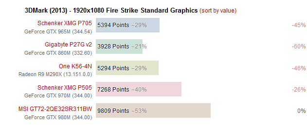 Нам также предлагается (источником выступил ресурс Notebookcheck) посмотреть на результаты выступления в некоторых приложениях оборудованного видеокартой GeForce GTX 965M ноутбука XMG P705 от Schenker: