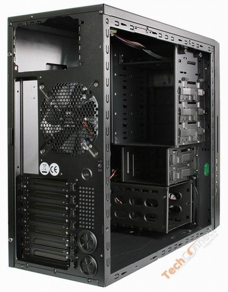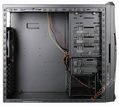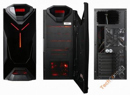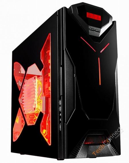 Характеристики "новинки" : Mid-Tower корпус с габаритами 206x459x522 мм и весом 8.2 кг. Имеется на борту 3 отсека под устройства размером 5.25 дюйма, на передней панели расположены 1 eSATA, два аудио и столько же USB 2.0 портов. LCD экран на верхушке стального ящика показывает температурные показатели внутри системника. Конечно же предусмотрены отверстия под шланги СВО, а охлаждением занимаются три 120-мм вентилятора - спереди, сбоку и сзади. У всех кроме последнего - красная подсветка.
