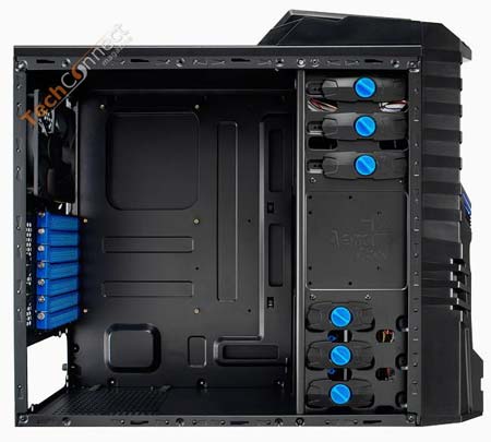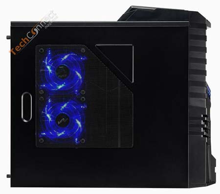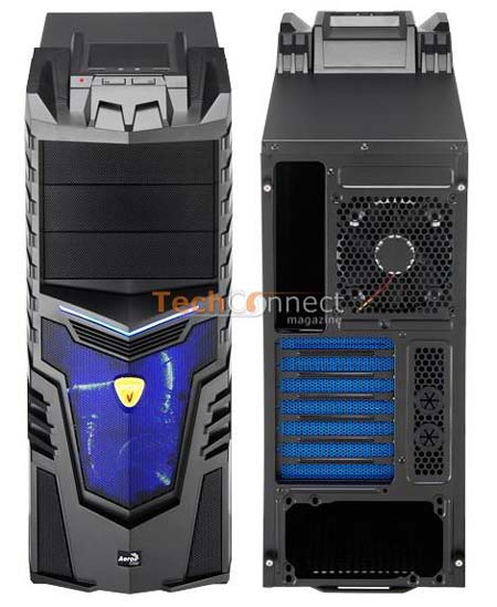 Как всегда, начну с габаритов корпуса: 488х187х520мм, вес не известен, но т.к. материалом изготовления является 0.5мм японская сталь SECC, можно предположить, что весит новинка не много. X-Warrior обладает всего тремя отсеками под 5.25" устройства, четырьмя установочными местами для 3.5" винчестеров и одним - для 2.5". Предустановлено два 120мм вентилятора - один с синей или же красной светодиодной подсветкой спереди, другой - сзади (этот вовсе без подсветки). Оба они работают на постоянной скорости в 1500 оборотов в минуту (которую наверняка можно уменьшить встроенным почти в каждый корпус Aerocool реобасом), издавая шум на уровне ~26 децибел.
