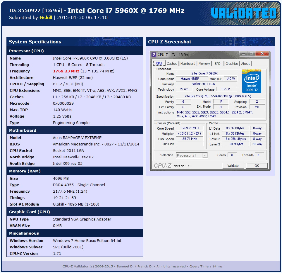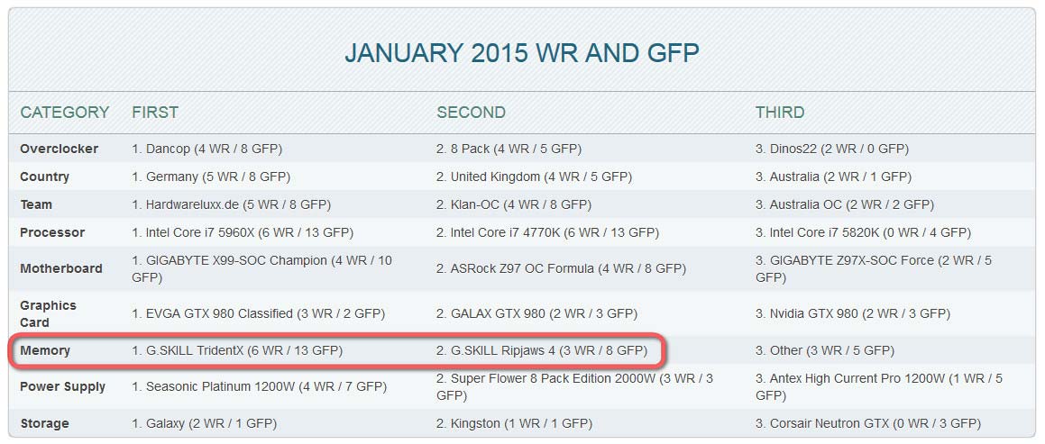В составе тестового стенда трудилась системная плата ASUS Rampage V Extreme с процессором Intel i7-5960X, охлаждался который, судя по всему, жидким азотом. Всего в январе было поставлено 9 рекордов с использованием памяти производства G.Skill, помимо Ripjaws 4 отличились модули TridentX.
