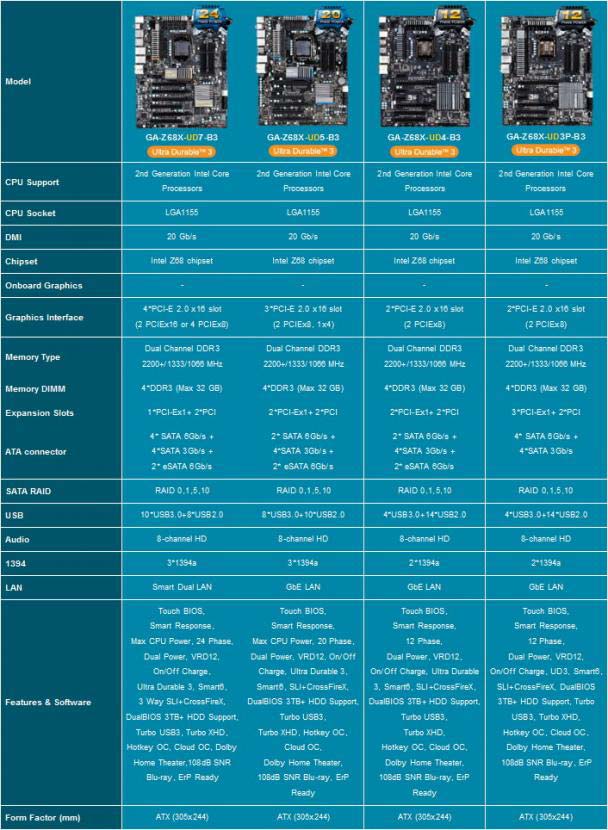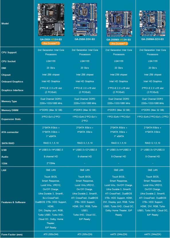 Gigabyte решила, что показывать по 3-4 системных платы - занятие не для компании её уровня, потому без какой-либо помпезности, было продемонстрировано сразу 11 (!) материнских плат на базе чипсета Z68 Express.