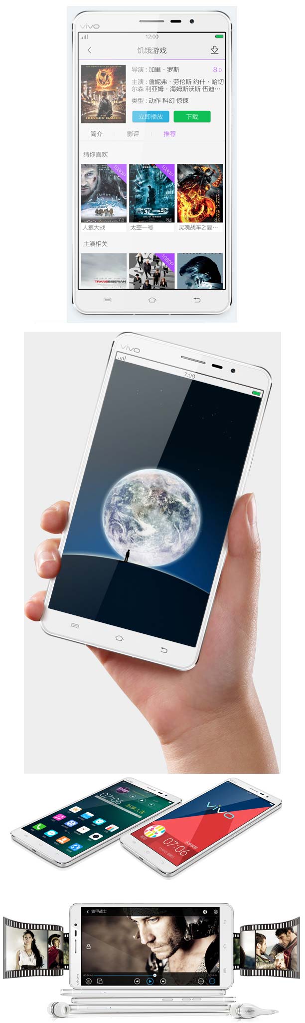 Спецификации аппарата я взял с китайского сайта Vivo, итак: новинка имеет размеры 158.2x82.59x8.68мм, весит 172 грамма, питается от батареи на 3200 мАч. Управлять аппаратом доверено Android 4.3, внутри планшетофона работает Snapdragon 800 (четыре ядра, 2.3ГГц), 3ГБ оперативной памяти и 32ГБ памяти для файлов пользователя, которые можно значительно расширить карточкой памяти.