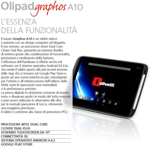 Аппарат именуется Olipad Graphos A10, это планшет с 10" IPS экраном, разрешение которого составляет 1280x800, поддерживается 5-точечный Multi-touch. Основой девайса стала некая двухъядерная SoC Intel Atom Clover Trail+, оперативной памяти в наличии 1ГБ, места для файлов владельца выделено 16ГБ с возможностью расширения.