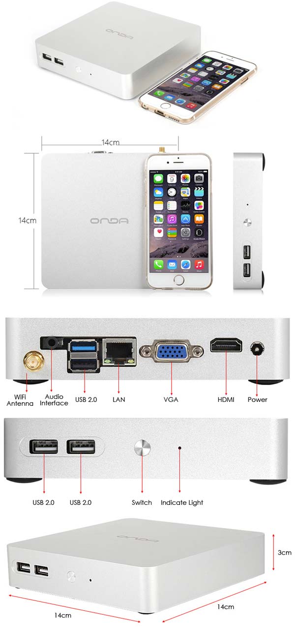 Onda M2 облачён в серебристый металлический корпус размерами 140x140x30мм, весит изделие 520 граммов. Основой мини-ПК стал 4-ядерный процессор Intel Pentium J1900, объём оперативной памяти равен 4ГБ, места для файлов пользователя выделено 128ГБ, тип накопителя - SSD.