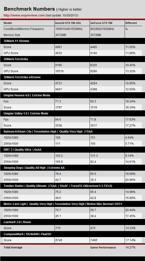 Итог тестов такой - GeForce GTX 780 GHz быстрее обычной GTX 780 на 14.27%.