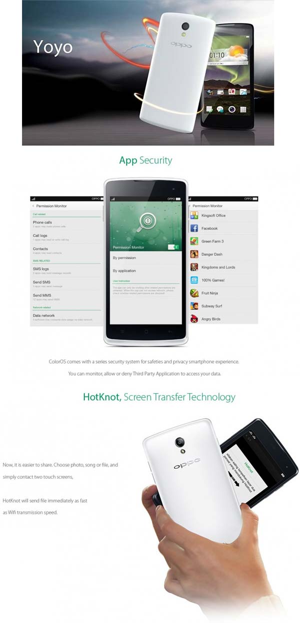 Смартфон Yoyo имеет 4.7" IPS экран с разрешением 960x540, у него 1ГБ оперативной памяти и 4ГБ флеш памяти для файлов пользователя, которую можно расширить на 32ГБ. Управляет китайским аппаратом Android 4.2.2 с Color OS 1.2, из особого функционала новинки стоит отметить поддержку технологии HotKnot, позволяющей передавать файлы с аппарата на аппарат сближением их сенсорных экранов, скорость передачи данных сравнима с WiFi.