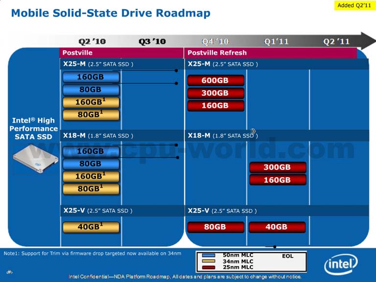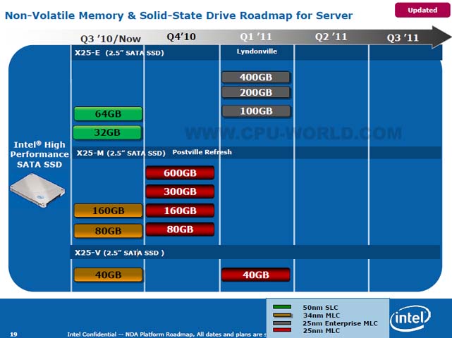 Интересно узнать когда выйдут долгожданные X25-M и X25-E нового поколения? Мне тоже! К нашей общей радости, коллеги с сайта Cpu World, раздобыли слайды с roadmap'ами Intel, касающиеся как раз новых твердотельных накопителей.