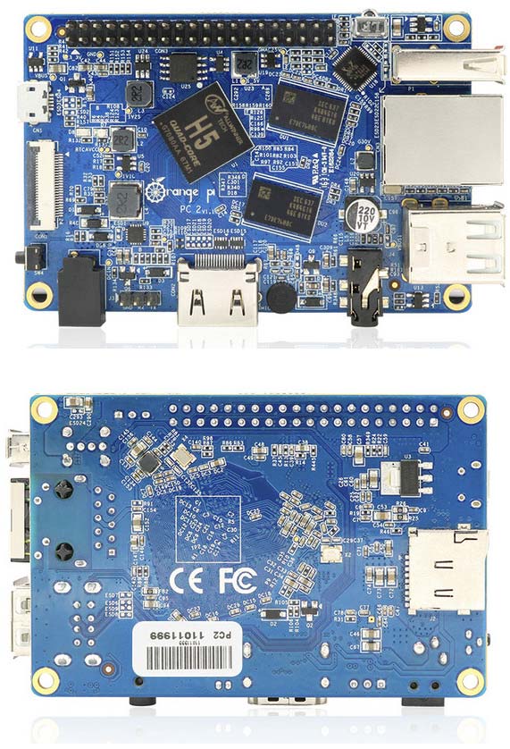 Устройство получило имя Orange Pi PC 2, в основе платы лежит SoC Allwinner H5, которая состоит из четырёх ядер Cortex A53 и графического решения ARM Mali-450 MP4. Объём оперативной памяти DDR3 равен одному гигабайту, в качестве накопителя выступает microSD карточка, поддерживаемая ёмкость - по 64 гигабайта включительно. Есть на Orange Pi PC 2 и 8 мегабит SPU NOR флеш памяти.
