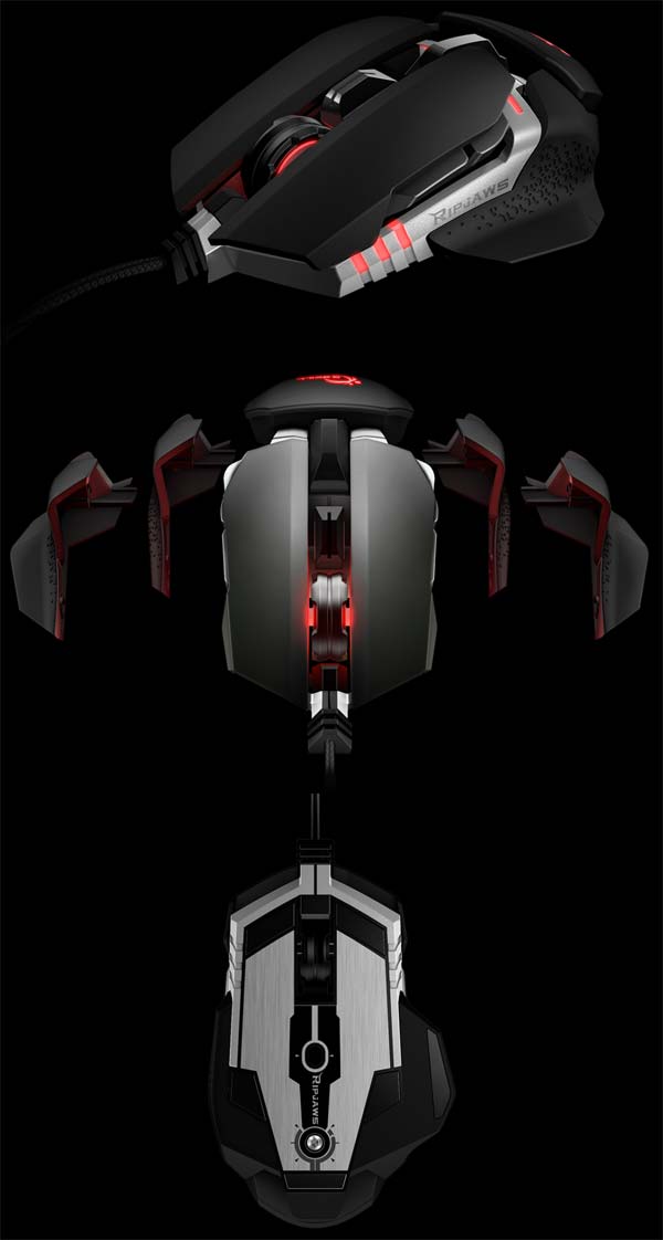 Новое решение именуется RIPJAWS MX780, это игровая мышка на базе лазерного сенсора Avago, разрешение которого можно настраивать от 100 до 8200 точек на дюйм. Кнопок у мышки восемь, все они имеют в основе микропереключатели от Omron (каждый выдерживает до 20 миллионов кликов), все кнопки программируются, всего в памяти изделия, а её в наличии 512 килобайт, может храниться пять пользовательских профилей.