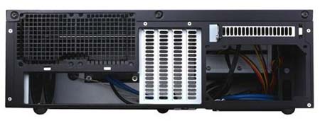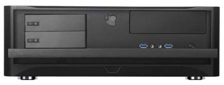 Габариты новинки, предназначенной для материнских плат форм-факторов MicroATX, mini-DTX и mini-ITX: 440х150х340мм, вес - 5.6КГ. Почти полностью корпус сделан из 0.8мм стали SECC, только лишь передняя дверка сделана из алюминия. Корпус чёрного цвета (правда, только снаружи) способен вместить в себя четыре 3.5" накопителя и один 2.5" (также есть вариант с размещением двух 2.5" и трёх 3.5" винчестеров/SSD).