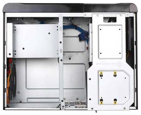 Отсеков для BD/DVD-ромов (да и мало ли чего ещё, что влезет в 5.25") - одна штука. Производитель не поленился вставить внутрь шасси три 120мм вентилятора - два на правую стенку и один - на левую. Максимальная длина видеокарты, что войдёт в этот корпус - 11 дюймов.