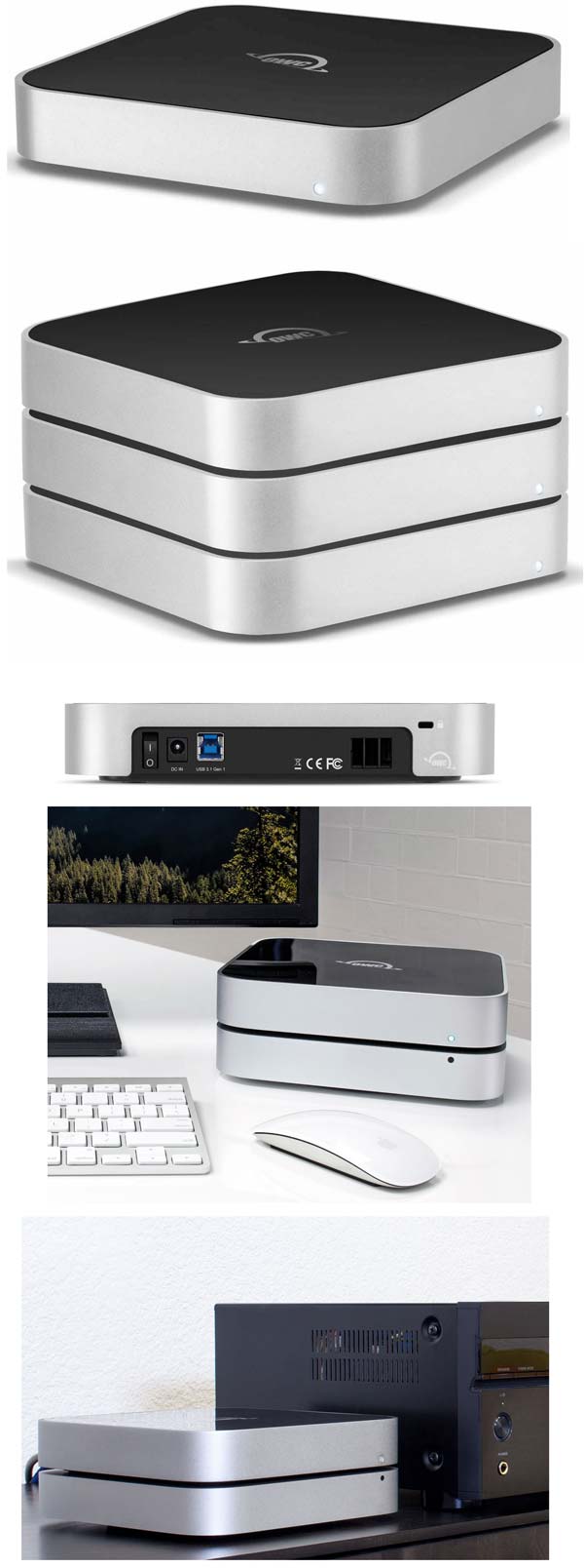 Особенностью накопителей серии является то, что их можно ставить один на другой, это должно заметно сэкономить место на рабочем столе при необходимости подключения сразу нескольких накопителей. Корпуса аппаратов сделаны из алюминия, имеется тихая система активного охлаждения MagLev, есть модель без накопителя внутри, т.е. пользователь сам должен определиться с винчестером (или SSD 3.5" типоразмера) для помещения внутрь детища OWC.
