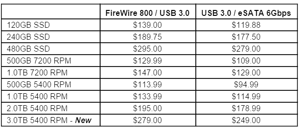 Как и ранее, новый Mercury Elite Pro mini надёжно защищён алюминиевым корпусом размерами 5.5x3.8x1.1 дюйма, однако теперь внутри решения спрятан 3ТБ винчестер форм-фактора 2.5", новинка не требует внешнего питания, доступна в двух вариантах - с интерфейсом подключения FireWire 800/USB 3.0 и USB 3.0/eSATA 6Гб/с.