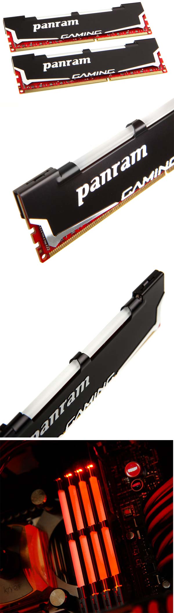 Новинка от Panram предназначена для работы с обычными ПК, т.е. это DDR3 DIMM модули. Задержки обозначены следующие: CL 11-13-13-35, рабочее напряжение - 1.65 вольт, тактовая частота - 2400МГц. Разумеется, раз уж модулей в комплекте два, они работают в двухканальном режиме. Более того - они поддерживают XMP 1.3 и обладают алюминиевыми радиаторами, цвет которых - чёрный. Для придания новинкам особого блеска производитель оснастил своё творение красными светодиодами.