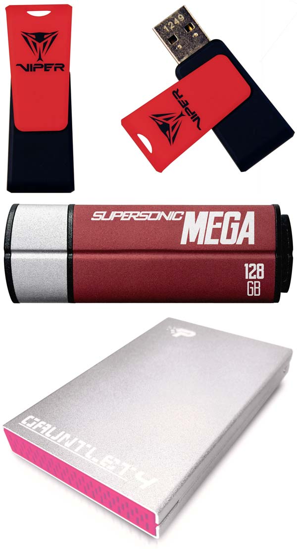 Компания Patriot явила миру две флешки, обе с подключением по интерфейсу USB 3.1, названия накопителей: Viper USB и Supersonic Mega USB. Первое решение представляет собой флешку с резиновым покрытием и прочным корпусом, созданную для геймеров, скоростные характеристики не приведены, зато известна ёмкость - от 64 до 256 гигабайт. У второго решения корпус самый обычный, зато указана скорость работы - до 380МБ/с на чтение и до 70МБ/с на запись данных, ёмкость - от 128 до 512 гигабайт.