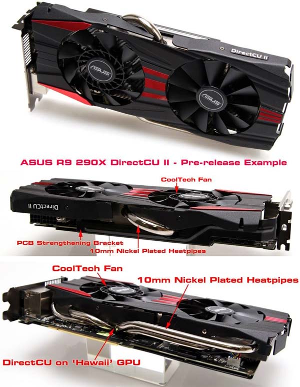 О новинке неизвестно практически ничего, кроме её названия - Radeon R9 290X DirectCU II. Из имени продукта ASUS ясно, что она укомплектована фирменной системой охлаждения DirectCU II, казалось бы - эка невидаль, однако не всё так просто, ведь данный кулер был улучшен специально для того, чтобы охлаждать R9 290X до приемлемых температур, ведь, как мы знаем, карточка очень горячая.