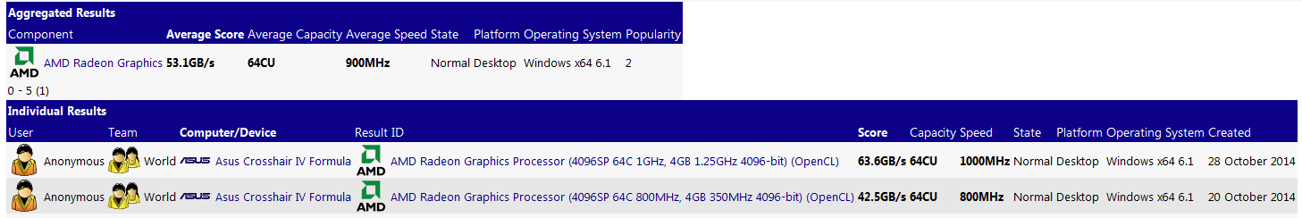 Согласно указанной БД, у R9 390X в наличии целых 4096 потоковых процессоров, 64 вычислительных блока (CU), 4ГБ видеопамяти GDDR5, работающей на тактовой частоте 5ГГц, а также ядро с частотой в 1ГГц (в Boost). У более простой карты 3520 потоковых процессоров и 44 вычислительных блока.