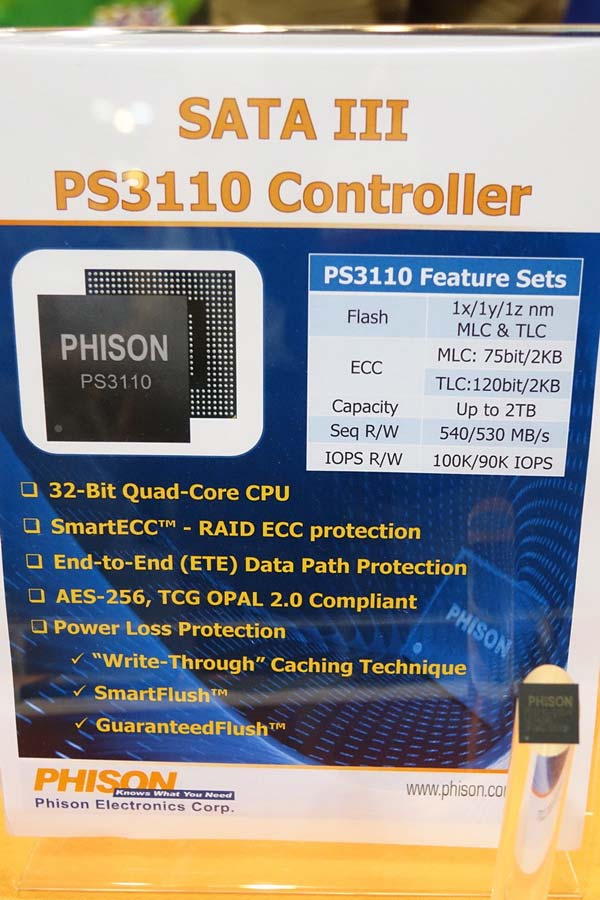 Аппарат получил имя PS3110, говорится, что устройства им оснащённые смогут использовать 1Yнм и 1Zнм SLC, MLC и TLC память, ёмкость таких SSD может составлять до двух терабайт. Нам обещают, цитирую, "ультра высокую" производительность, в понимании Phison это 550МБ/с на чтение и 530МБ/с на запись данных, т.е. примерно тоже самое, что ~3 года назад предложила на SandForce в своих контроллерах SF-2281.