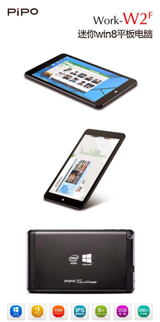 Экран планшета Pipo W2F имеет диагональ 8", его разрешение составляет 1280x800, он использует IPS технологию. У новинки две камеры: 5МП тыловая и 2МП фронтальная, есть видеовыход HDMI, G-сенсор и поддержка Bluetooth 4.0 вместе с WiFi, а вот поддержка 3G/WCDMA опциональна. Доступные цвета агрегата: серый и белый, чёрный, синий.