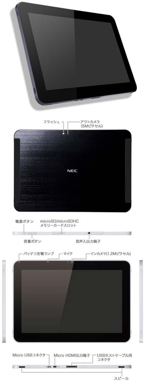 У NEC LifeTouch L имеется слот для карточек microSD/SDHC, а также порт Micro USB и видеовыход Micro HDMI. Время автономной работы ~13 часов, цифра немалая, благодарить за это стоит батарею на 7710 мАч. Управляется планшет Android 4.0, что вполне типично для аппарата 2012 года разработки.
