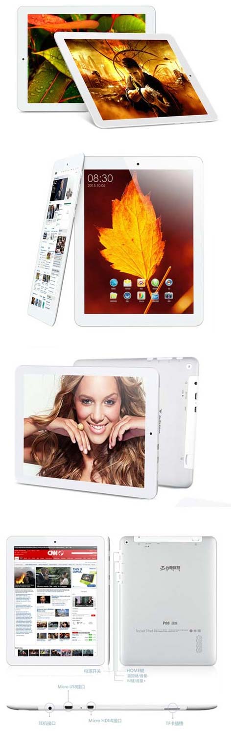 Питается изделие от встроенной литий-полимерной батареи на 4500 мАч. У новинки имеется поддержка множества медийных форматов файлов, также планшет дружит с Adobe Flash 11.1. Имеющиеся порты: micro USB, micro HDMI, слот для карточек SD и 3.5 выход на наушники. Размеры Teclast P88 составляют 200.2x151.3x8.6мм, вес устройства равен 413.9 граммам.