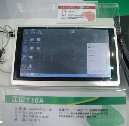 Было показано две модели - одна с одним экраном (T10A), другая - с двумя, однако точных характеристик не прозвучало. Упоминалось лишь о том, что у первой модели диагональ сенсорного экрана 10.1", а у второй - два экрана по 8 дюймов. Процессор в планшетниках используется производства самой VIA, обладает тактовой частотой в 1.2ГГц, оперативной памяти - 1ГБ, в качестве накопителя выступает 32ГБ SSD. У устройств имеется веб-камера, а предустановленная операционная система - Windows 7, скорее всего Home Premium x86.