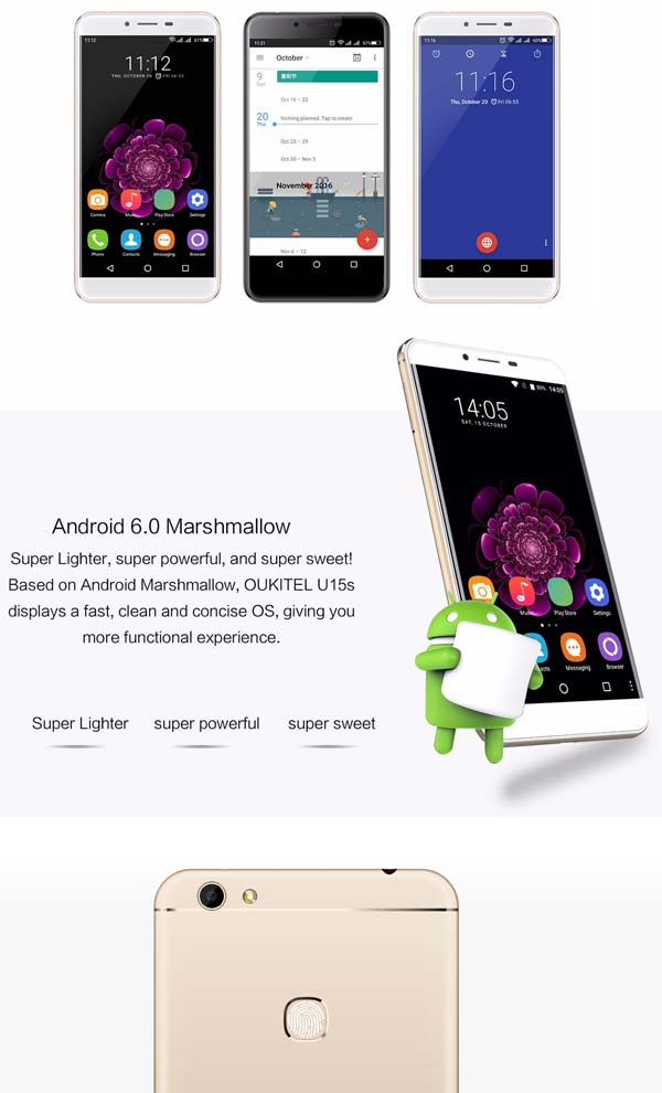 Тыловая камера U15S получила 13МП сенсор и вспышку, фронтальная - 5МП. В наличии светосенсор, датчик приближения и G-сенсор. Питается устройство от встроенной батареи на 2450 мАч. Размеры составляют 151x76x7.6мм, вес равен 170 граммам. Не обошлось без наличия сканера отпечатков пальцев.