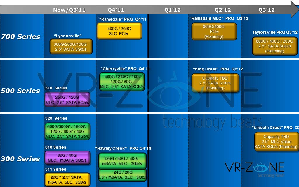 Коллеги с VR-ZONE раздобыли слайд с Roadmap'ом (графиком выпуска) твердотельных накопителей Intel вплоть до 3-го квартала 2012 года.
