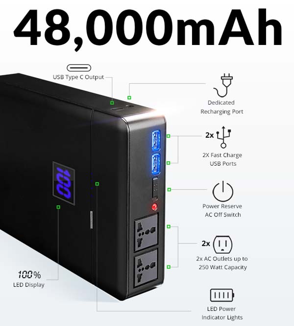 Изделие обладает двумя USB и одним USB Type-C, а также парочкой розеток для техники. Сообщается, что в аппарате используются высококачественные аккумуляторы от Tesla, заряжать которые можно как от электросети, так и от солнца. Агрегата хватит чтобы зарядить 3 ноутбука, 28 смартфонов, 7 планшетов, 3 дрона, питать мини-холодильник до 8 часов или телевизор до 4 часов.