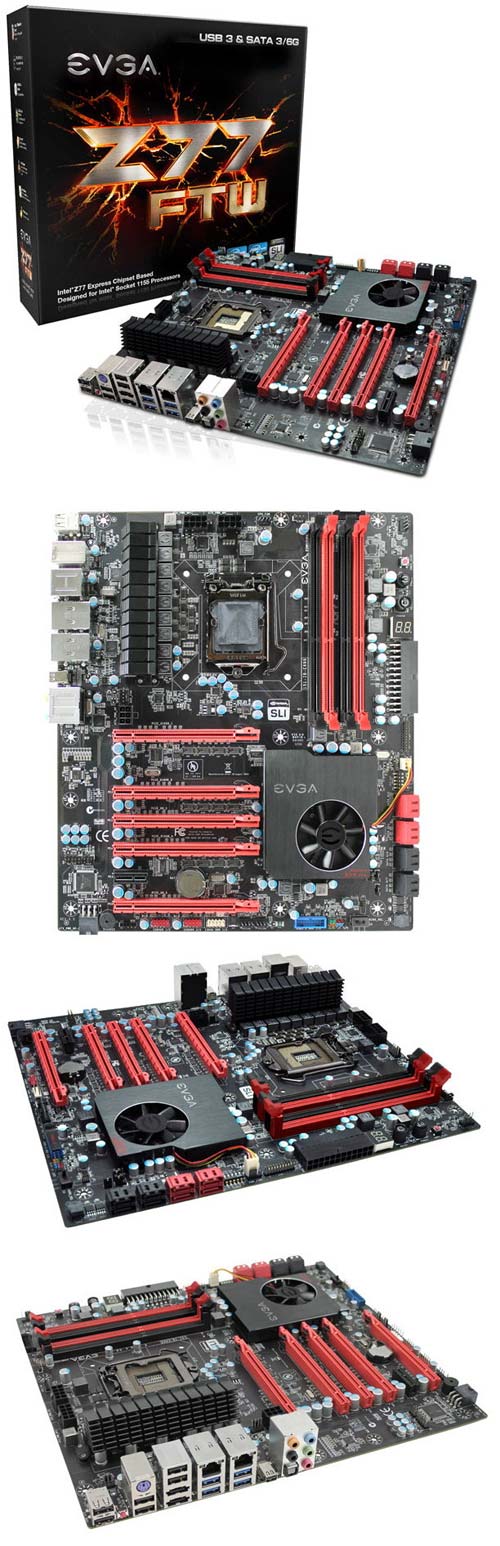 Например у EVGA на сайте уже можно прикупить системную плату для процессоров Core второго и третьего поколений (LGA1155), именуемую Z77 FTW. Новинка выполнена в форм-факторе eATX, обладает четырьмя слотами для оперативной памяти DDR3-2133, пятью слотами PCI-Express X16/x8 (поддержка SLI и CFX имеется), четырьмя SATA 6Гб/с и таким же количеством SATA портов предыдущего поколения.