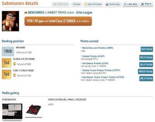 | BenchBros HWBOT Prime Проверка - Количество очков: 9761.78 - Материнская плата: MSI X99A GODLIKE GAMING - Процессор: Intel i7-5960X |