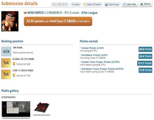 | BenchBros Cinebench R11.5 Проверка - Количество очков: 25.82 - Материнская плата: MSI X99A GODLIKE GAMING - Процессор: Intel i7-5960X |