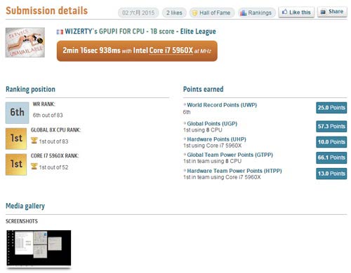 | Wizerty GPU PI For Процессор 1B Проверка - Время: 2 минуты 16 секунд 938 м.секунд - Материнская плата: MSI X99A GODLIKE GAMING - Процессор: Intel i7-5960X |