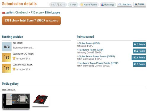 | Zzolio Cinebench R15 Проверка - Количество очков: 2381 cb - Материнская плата: MSI X99A GODLIKE GAMING - Процессор: Intel i7-5960X |