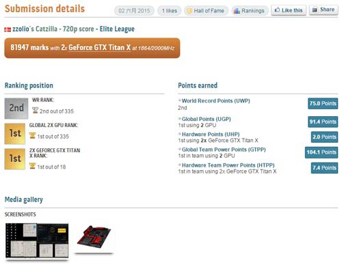 | Zzolio Catzilla 720P Проверка - Количество очков: 81947 - Материнская плата: MSI X99A GODLIKE GAMING - Процессор: Intel i7-5960X - Видеокарта: MSI GeForce GTX Titan X |