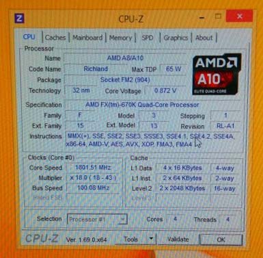 Данными о процессоре поделился форум ресурса Hardware Canucks, изделие называется FX-670K, замечено оно было в конфигурации настольного компьютера Pavilion 500-266ea от HP. Новинка представляет собой обычный APU Richland, но с отключенным графическим ядром, предназначена для системных плат с сокетом FM2, построена на микроархитектуре Piledriver от AMD. Тактовая частоты изделия может достигать 3.7ГГц, хотя базовая составляет 1.8ГГц. Количество ядер равно четырём.