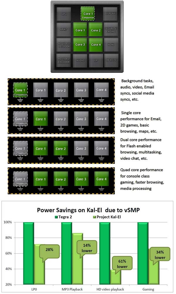 Итак, по последним данным, у изготовленного по 40нм тех.процессу Kal-El / Tegra 3 будет не четыре, а пять ядер Cortex-A9. Пятое будет выполнять простейшие функции (указано вот что: получение/отправка e-mail, синхронизация с соц.сетями, фоновые задачи, аудио и видео) и иметь более низкую рабочую частоту (500МГц) и низкое энергопотребление (в сравнении с оставшимися ядрами, тактовая частота которых 1.5ГГц).