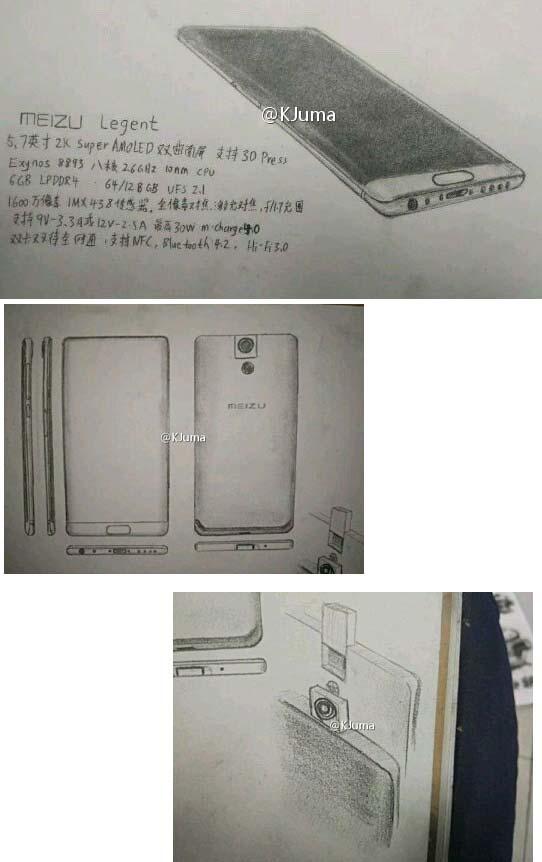 Зарисовки ниже демонстрируют аппарат Meizu Legent, ошибки во втором слове нет, оно не английское, а латинское. Изделие базируется на Exynos 8893 от Samsung, обладает 6ГБ оперативной памяти, до 128ГБ флеш памяти, 5.7" QHD 2.5D изогнутым экраном, батареей на 3400 мАч. Управляемый Android 7 с Flyme 6 OS девайс получил вращающуюся 16МП камеру, которая сгодится для обычной съёмки и для селфи. Питается могучий фаблет от батареи на 3400 мАч.