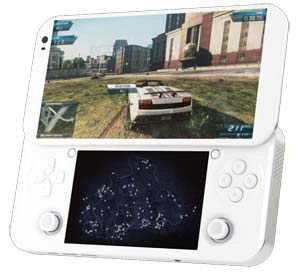 Изделие именуется Portable Gaming System, будет выпущено в двух вариантах - Hardcore и Lite. Оба аппарата основаны на Intel Atom x7-Z8750, имеют 4.5" дополнительный IPS экран, органы управления (кнопки, джойстик, мини-стики) на этом сходство в техническом плане заканчивается.