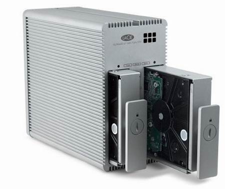 Перед нами внешний жёсткий диск (на деле - корпус для винчестеров с ними же внутри), габаритами 93х200х183мм и весом 3.6КГ (ого!). Внутри его корпуса (дизайн которого разрабатывал Нил Полтон) уютно расположились два 3.5 дюймовых жёстких диска, скорость вращения шпинделя которых составляет 7200 оборотов в минуту. Винчестеры могут работать в режимах RAID 0,1 или JBOD. Скорость передачи данных - до 200 мегабайт в секунду. В комплекте дают софт для создания резервных копий под Windows и Mac.