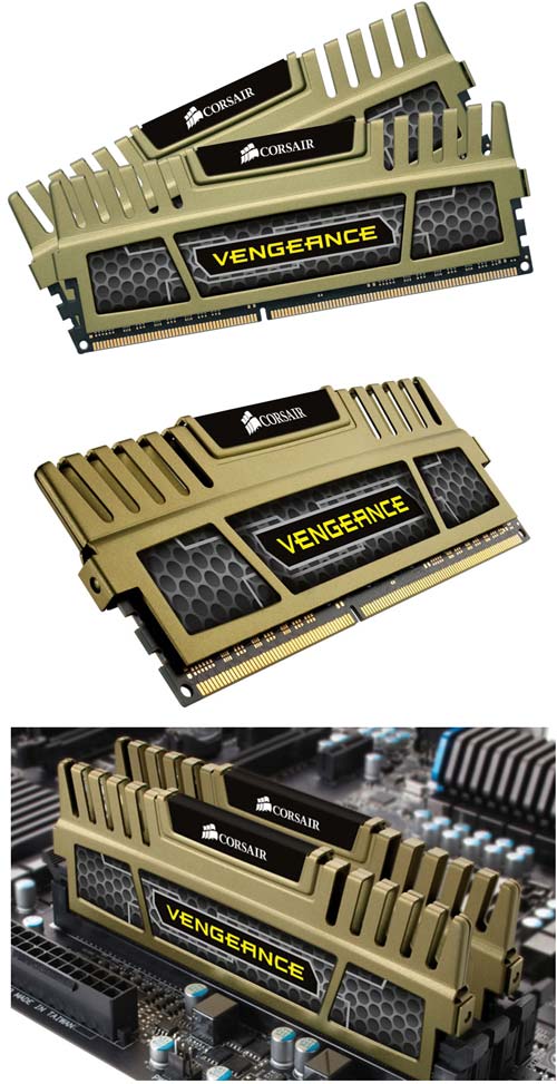 Не абы какая новость, с учётом того, что про CMZ16GX3M2A1600C9 обычного цвета я уже писал. Так что кроме как цветом радиаторов новинка ничем не отличается от того комплекта, что мы видели этим летом. "Золотой" набор CMZ16GX3M2A1600C9 состоит из двух 8ГБ модулей DDR3 памяти Vengeance, функционирующих на частоте 1600МГц при таймингах 9-9-9-24 и напряжении в 1.5 вольта.