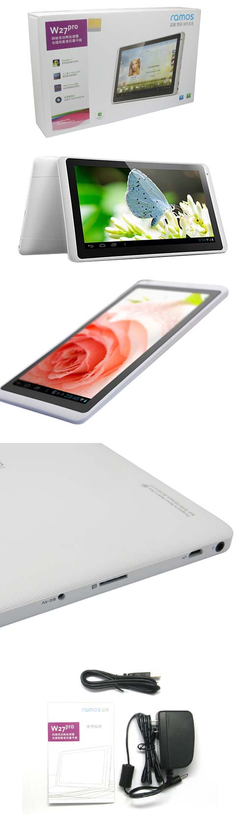 Ramos W27PRO имеет 0.3МП фронтальную камеру, G-сенсор, поддержку 802.11b/g/n WiFi, порт micro USB 2.0/OTG, слот для карточек SD/SDHC, да 3.5мм выход на наушники. Цвет корпуса планшета - белый но рамка вокруг экрана черная.