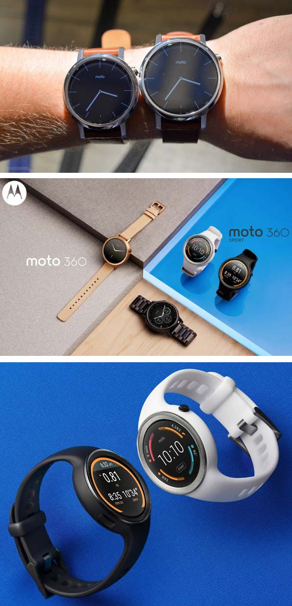 Новинок представлено две - Moto 360 и Moto 360 Sport, причём первая будет доступна в двух размерах с 46мм и 42мм корпусами, у первой 1.56" экран с разрешением 360x230, у второй 1.37" с разрешением 360x225, первая питается от батареи на 400 мАч, а вторая от 300 мАч, оба гаджета управляются Android Wear.